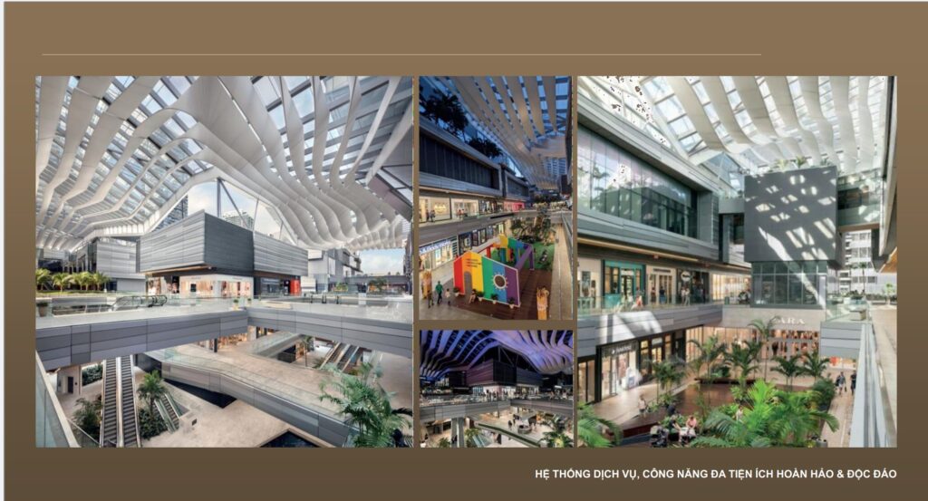 Tiện ích: TTTM hạng A; Hệ thống trường học, bệnh viện, trung tâm hành chính, Khu nhạc nước; công viên, phòng tập gym, spa, nhà hàng, coffee shop.